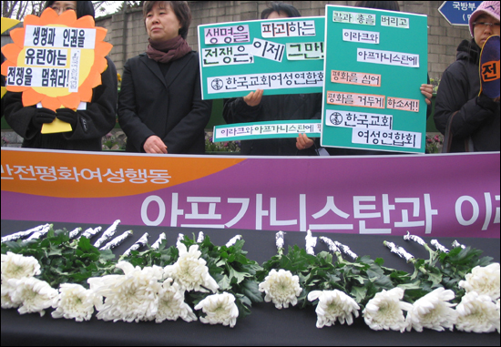 또 성명서를 통해 "전쟁터인 이라크와 아프가니스탄에서는 평화와 재건의 깃발이 아니라 살육과 강간이라는 절망만이 나부끼고 있다"며 "평화적 갈등해결만이 우리 젊은이들과 고통속에서 신음하고 있는 어린이, 여성, 약자, 주민들을 살리는 길이며, 이라크, 아프카니스탄에서 한국군을 즉각 철수할 것"을 촉구했다.