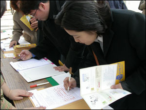 | ▲ 100만 유권자 서약을 하고 있는 캠페인 참여자의 모습. ⓒ 한국여성단체연합 | ||