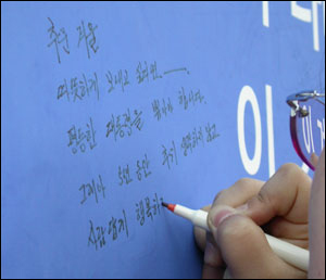| ▲ '희망의 벽'에 평등대통령 선출의 소망을 적고 있는 여성유권자의 모습. ⓒ 한국여성단체연합 | ||