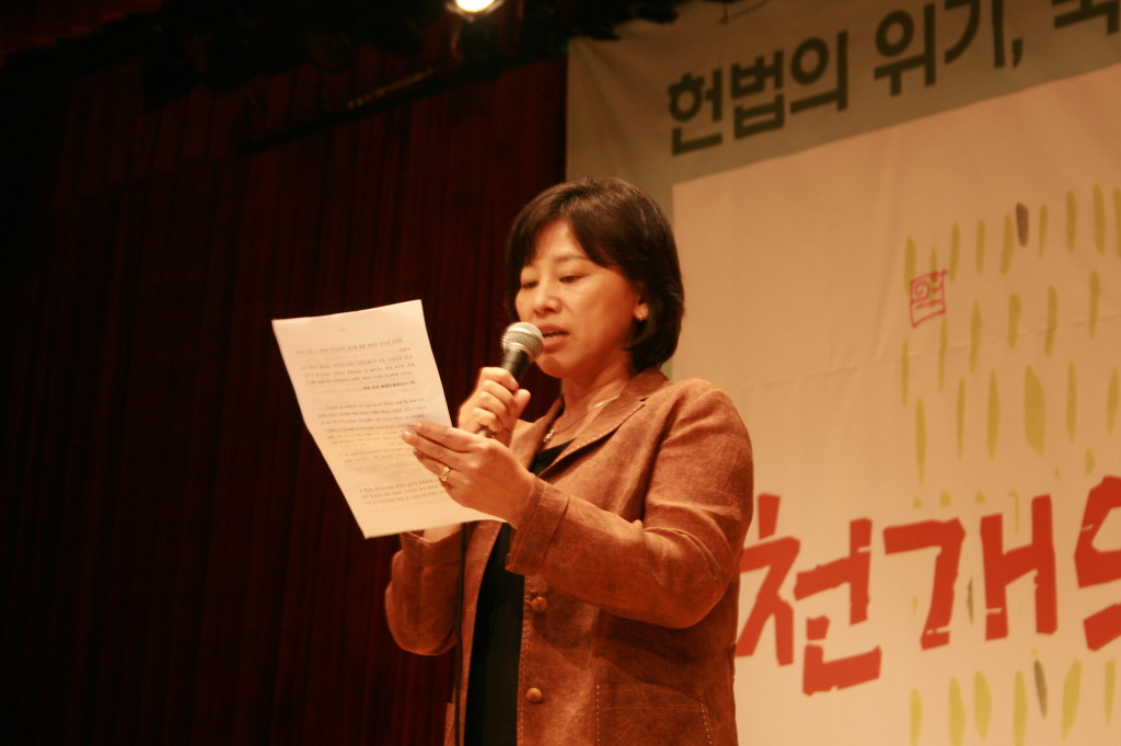 남윤인순 한국여성단체연합 상임대표의 대회사로 시작된 시국선언자대회는 교수/환경/청소노동자/여성/시인/보건의료/대학생/청년/네티즌/교사/공무원 등 각계 각층의 시국선언자들의 희망 발언으로 진행되었다.