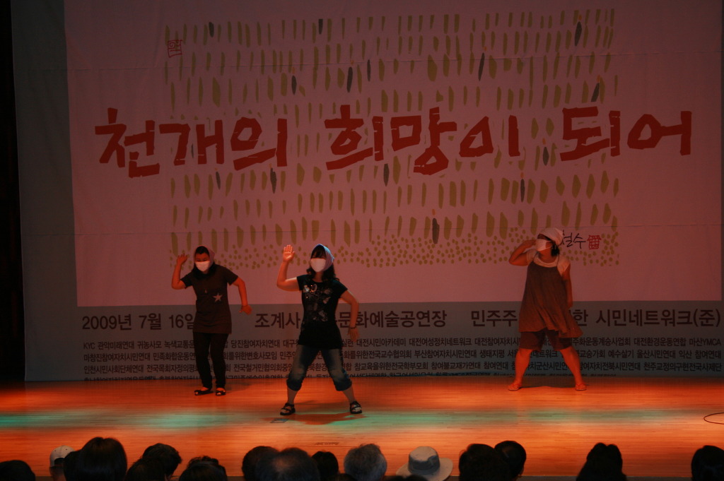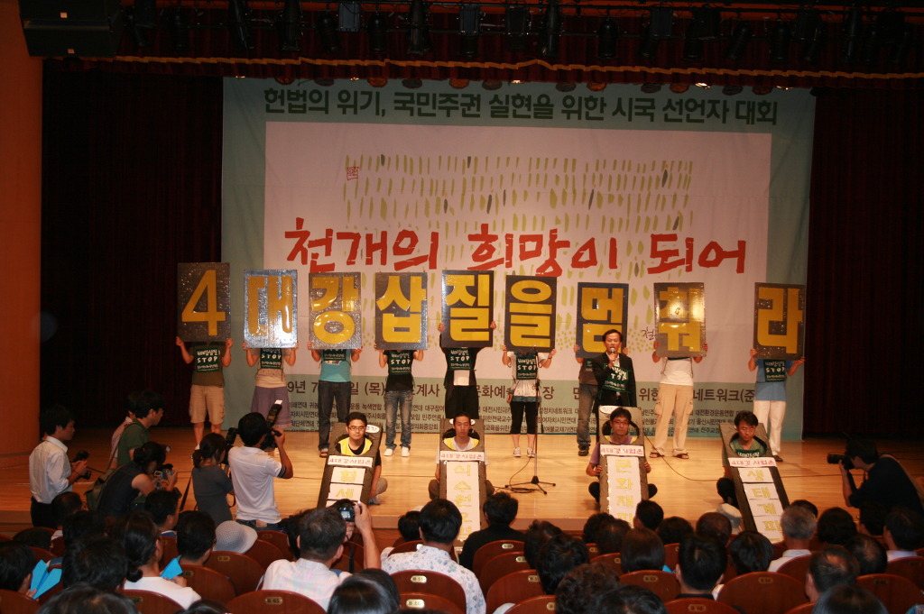 셋째, 투표를 통해 심판하기 위한 조직과 힘의 결집을 제안합니다. 이미 많은 시민들의 뜻이 여기에 있다고 확신합니다. 하지만 결코 만만한 일이 아님을 모두가 잘 알고 있습니다. 깨어있는 시민들의 조직된 힘을 만들기 위한 구체적이고 치밀한 준비가 필요합니다. 전국에서 시국강연회를 열고, 지역별로 1천개의 시국사랑방을 설치하고, 앞장설 분들과의 시국간담회를 진행하자고 제안 드립니다. 위헌적 위법적 통치행위와 서민말살 정책을 낱낱이 밝히고 장기집권구도를 파헤쳐 널리 알려 심판의 공감대를 더욱 확산합시다. 이를 위해 현재 30여개 시민단체가 모여 ‘민주주의를 위한 시민네트워크(준)’를 결성하고 뜻을 모으고 있습니다. 하지만 이러한 목표가 단체의 힘만으로는 절대 가능한 일이 아님을 너무 잘 알고 있습니다. 깨어있는 시민, 네티즌의 역량과 시민단체의 장점이 조화를 이룰 때 투표를 통해 심판하기 위한 광범위하고 거대한 힘이 형성될 수 있다고 믿고 전국적인 힘을 모으고자 합니다. 함께 하여 주십시오! 시국선언의 초심으로 민주주의와 국민주권 실현을 위해 이 자리에 함께 한 우리 스스로가 희망의 씨앗이 되겠다고 다짐을 합니다. 한걸음 더 국민 속으로 나아가 희망을 확산하기 위해 유쾌한 활동을 펼치겠습니다. 다시 뵙겠습니다. 2009년 7월 16일