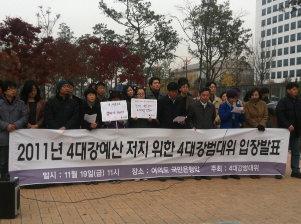 4대강사업저지범국민대책위원회는(이하 4대강범대위) 11월 19일(금) 오전11시, 여의도 국민은행 앞에서 2011년 4대강사업 예산 규탄 기자회견을 열었다.