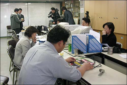 | ▲ 현재 범국민행동은 급한대로 안국동 참여연대 2층 강당을 빌려 임시 사무처로 쓰고 있다. 이곳에서는 30여명의 시민단체 활동가들이 파견돼 밤낮없는 일정을 보내고 있다. ⓒ 오마이뉴스 김지은 | ||