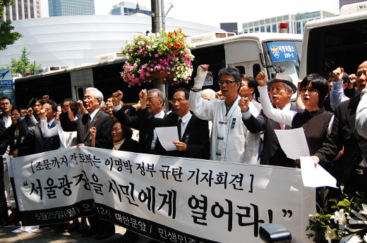 민생민주국민회의(준)는 5월 25일 월요일 정오, 서울 대한문 분향소 옆에서 조문까지 가로막는 이명박 정부를 규탄하며 서울 광장을 시민들에게 열 것을 강력하게 요구하는 기자회견을 열었다.