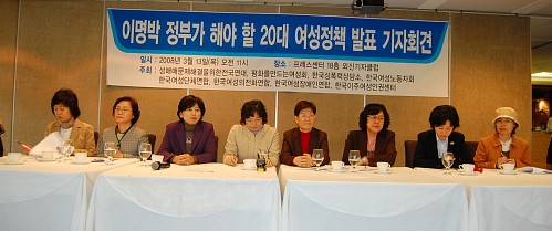 따라서 우리 여성단체들은 이명박 정부의 여성정책 부재에 대한 문제의 심각성을 상기시키고, 체계적이고 구체적으로 여성정책을 추진할 수 있도록 ‘이명박 정부가 임기 내에 반드시 추진해야 할 ’20대 여성정책’을 제안하고자 한다.
