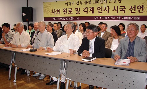 단언컨대 국민들의 거대한 분노와 전면적인 시민불복종 운동이 터져 나오는 상황에서 더 이상 이명박 정부의 정상적인 국정운영은 가능하지 않다. 이에 이명박 대통령과 정부에 지난 100일간의 국정파탄에 대한 뼈를 깎는 반성과 전면적인 쇄신을 요구하며 다음과 같이 우리의 입장을 밝힌다.