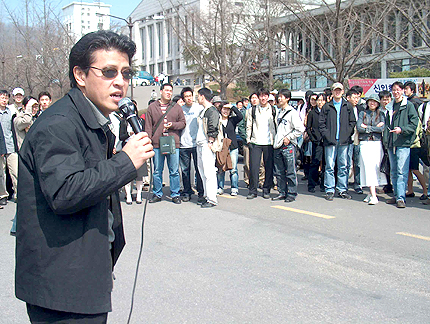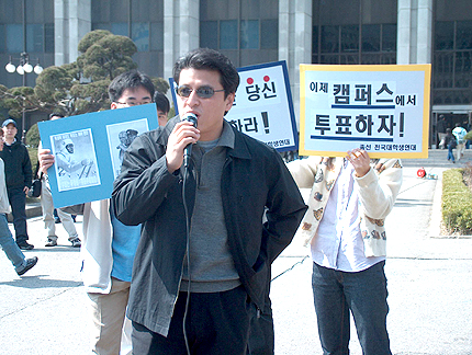 대학마다 부재자투표운동이 한창 진행되고 있는 가운데 <2004총선 대학생연대>가 24일 신촌에 위치한 홍익대, 연세대, 이화여대에서 마련한 '탄핵심판, 대학부재자 투표 축제'에 권씨가 초대된 것.