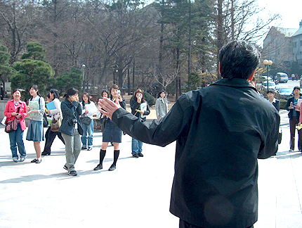 | ▲ 마지막 방문 대학인 이화여대. 권씨의 출현에 학생들이 카메라폰을 들고 사진찍기에 바쁘다 ⓒ 2004 박수선 | ||