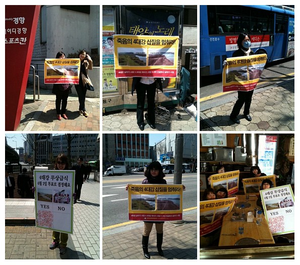 지난 4월 15일(목) 점심시간 여성연합은 4대강 사업 중단을 바라는 시민들의 마음을 모아 우리가 할 수 있는 가장 최소한의 행동이자 누구나 할 수 있는 합법적인 활동인 <4대강 사업중단 1인시위>를 진행하였습니다.