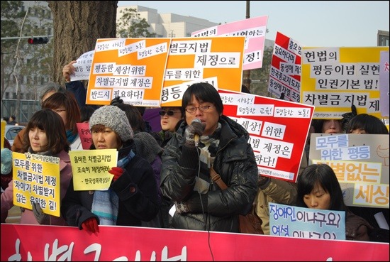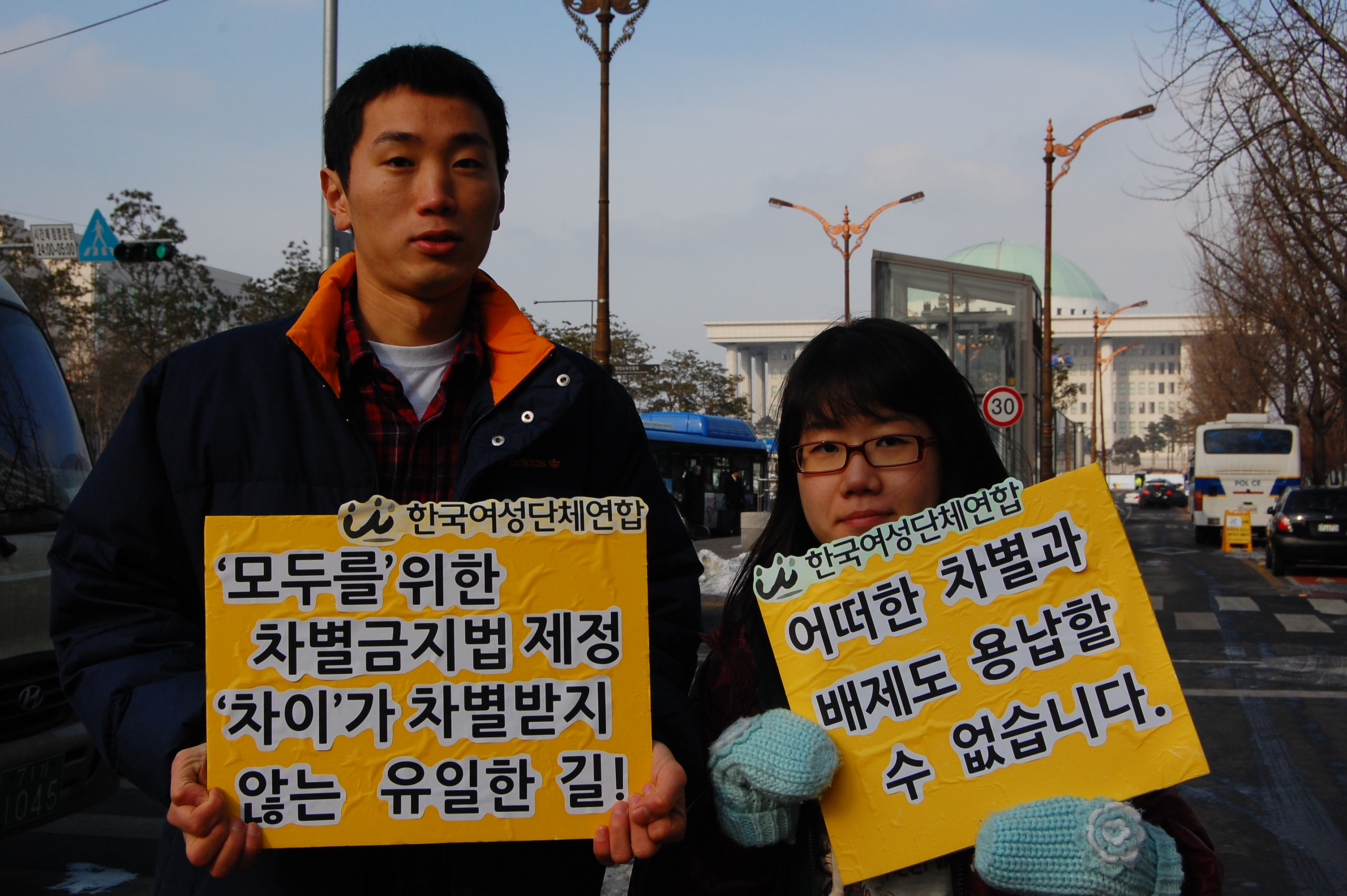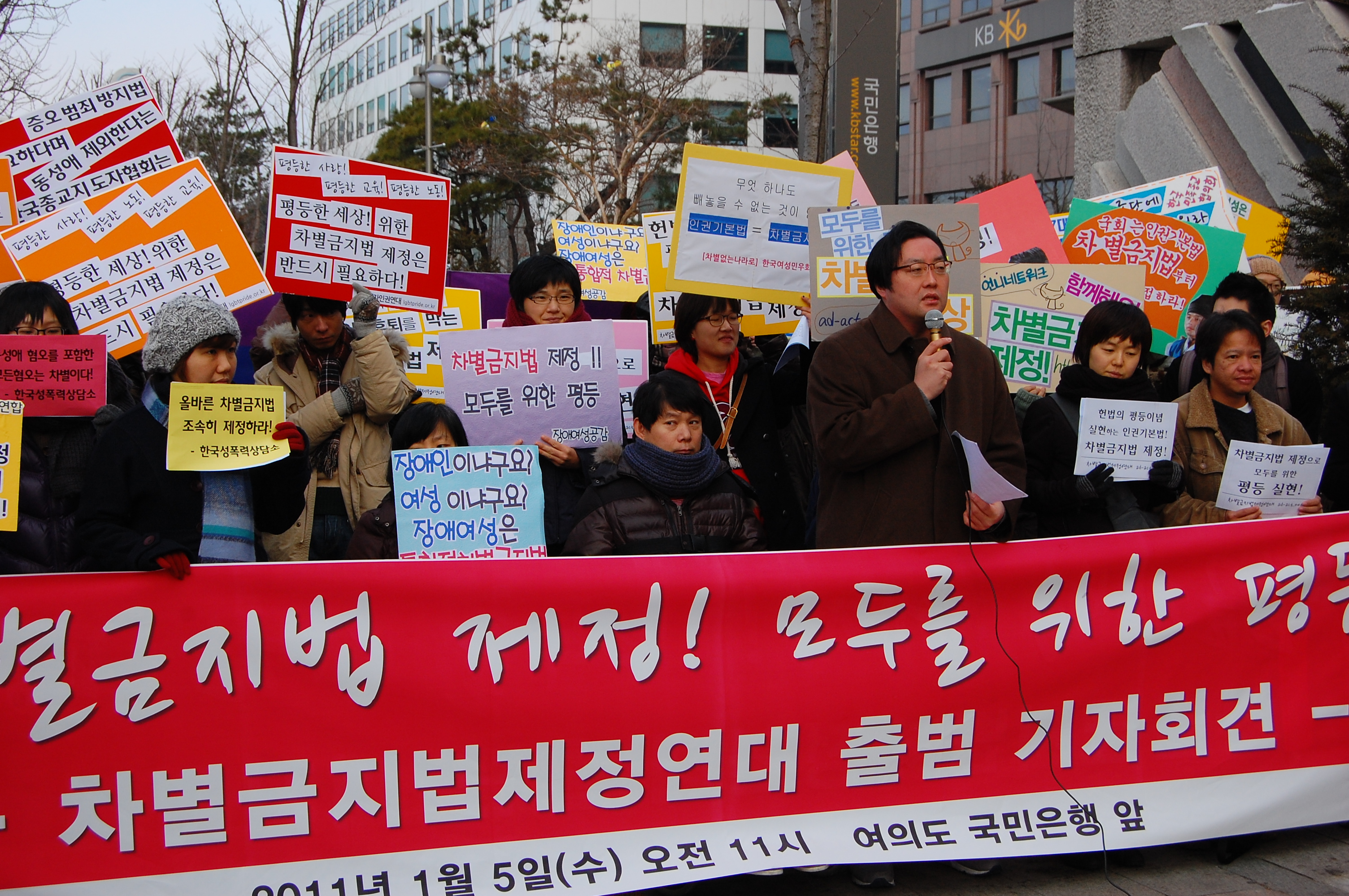 2011년 1월 5일(수) 오전 11시 여의도 국민은행 앞서 차별 금지법 제정을 취지로 하는 ‘차별금지법제정연대’의 출범 기자회견이 열렸다. 3년 넘게 끌어온 차별금지법 제정을 실현하고 우리사회의 보수화와 인권 후퇴를 막고자 사회적 소수자들을 대표하는 34개 단체들이 연합해 차별금지법제정연대를 출범하고 활동계획을 밝혔다.